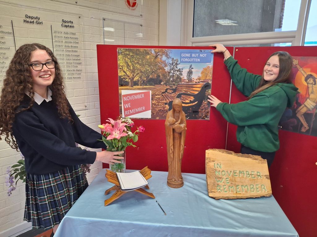 Isabelle and Mylagh in Transition Year students set up our Prayer Space in Reception to remember all those who have passed away. This was followed by a prayer service in the Oratory.