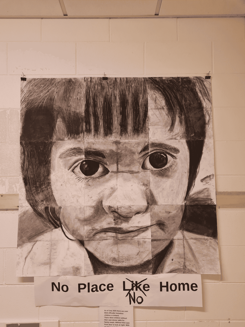 Mr Kenny’s 2nd Year art class created this artwork to highlight the ongoing homeless crisis in Ireland. Students worked in twos and threes on one of the nine panels which were then stuck together learning about the medium of charcoal and how art has a role to play in activism. As of August 2025 there are over 5145 officially homeless children in Ireland. That’s 5145 children without their own dinner table for family meals. Without their own front door to lock at night. With no place to build precious memories and who cannot say… “There’s no place like home”.